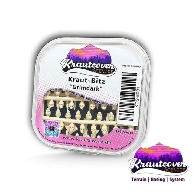 Our ‘Kraut Bitz’ are the ideal addition to our basing mixes to create even more interesting bases and terrain pieces. Kraut Bitz are produced using the injection moulding process and offer a large selection of parts in a total of 4 frames per pack, each packaged in 2 different frames in our usual caps to match the theme. The ‘Grimdark’ set contains everything to do with the popular Grimdark theme and includes the following bits. 94x skulls, 2x rat skeleton, 6x long bones, 2x bone hands, 4x spinal columns, 2x grimoire, 4x long purity seals, 4x short purity seals, 12x maggots, 2x smoke wavers, 2x altar crosses, 2x sceptres, 2x rosaries, 18x candles, 18x cartridges/cases