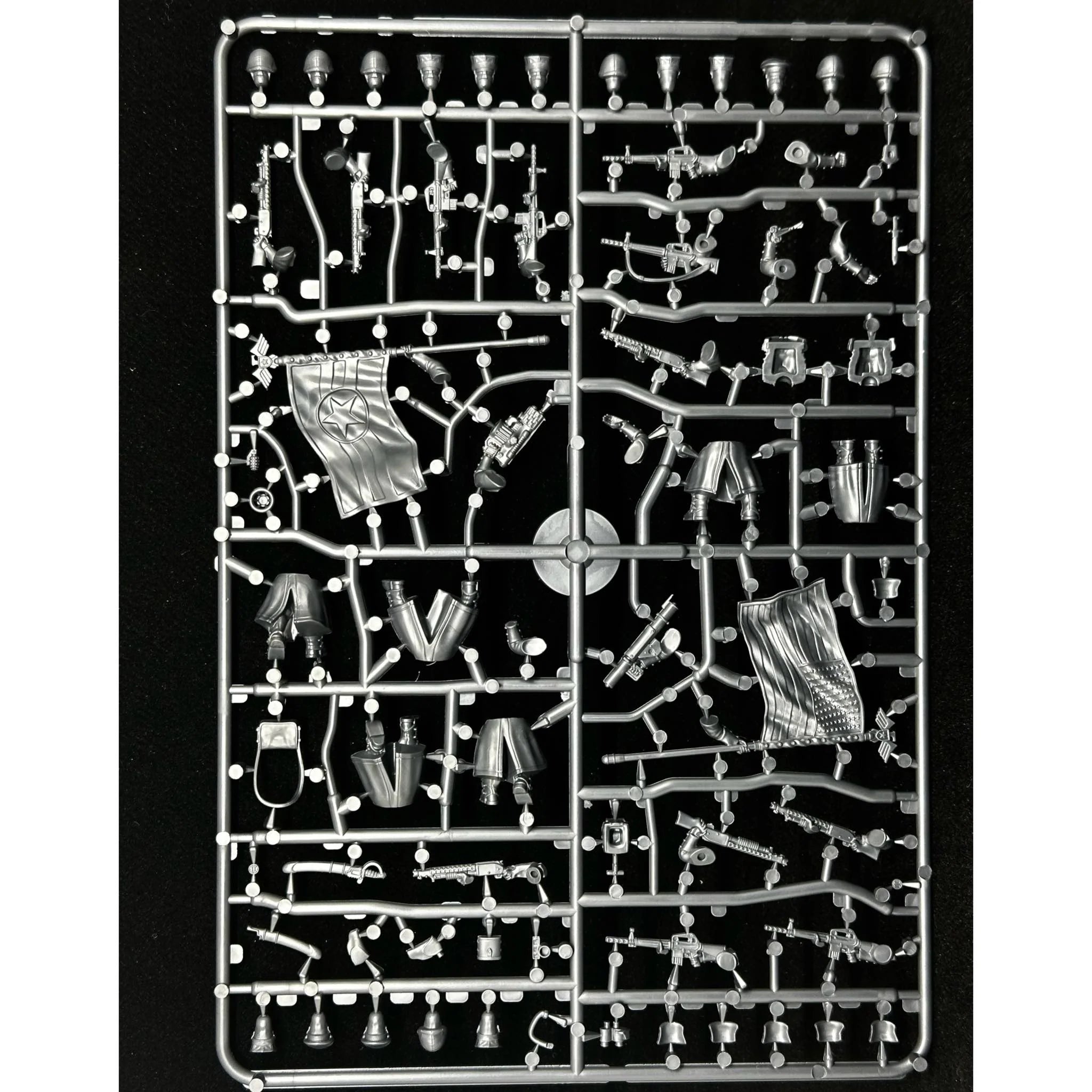 This box includes four frames containing a total of 12 hard-plastic infantry figures for the United States of America in Marcher: Empires at War. It includes options to equip a squad with trench guns or A16 Assault Rifles, along with bazookas, Heat Ray guns, officers, and specialists. This box includes 25mm bases.
